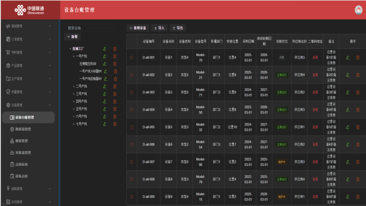 云设备管理平台是一款集设备全生命周期管理、实时状态监测、预测性维护、远程运维控制于一体的工业物联网运营平台。平台基于中国联通“5g专网+物联网+云平台”技术底座,通过部署轻量级边缘网关或协议适配模块,提供资产数字化建档、运行实时监控、故障智能预警、能效分析及远程调试等能力。旨在解决中小制造企业设备状态不可见、故障响应滞后、运维成本难管控等核心问题,助力企业以低门槛、高安全的方式实现从“被动维修”向“主动预防”的数字化转型。