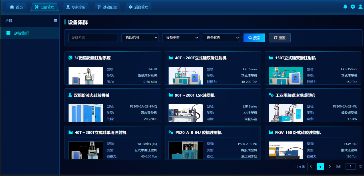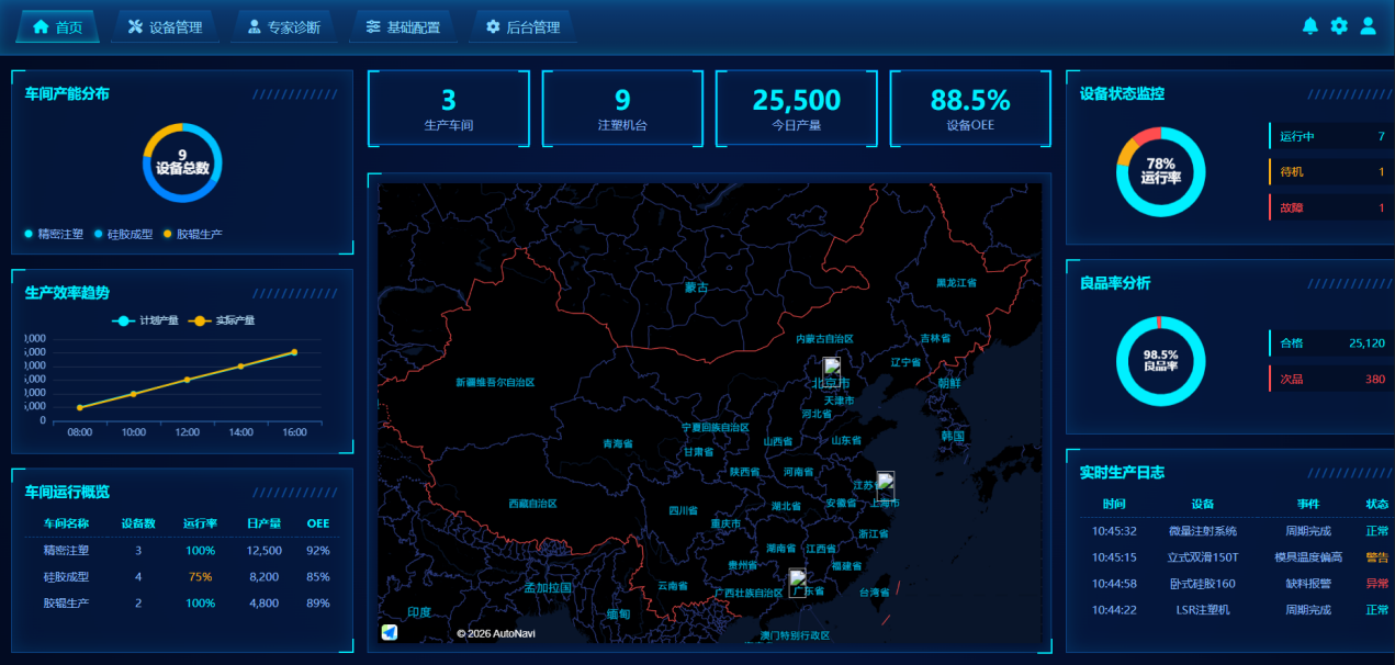 设备集群管理:统一纳管不同型号、不同地域的注塑机,实时监控运行状态、参数与位置,实现设备资产可视化。