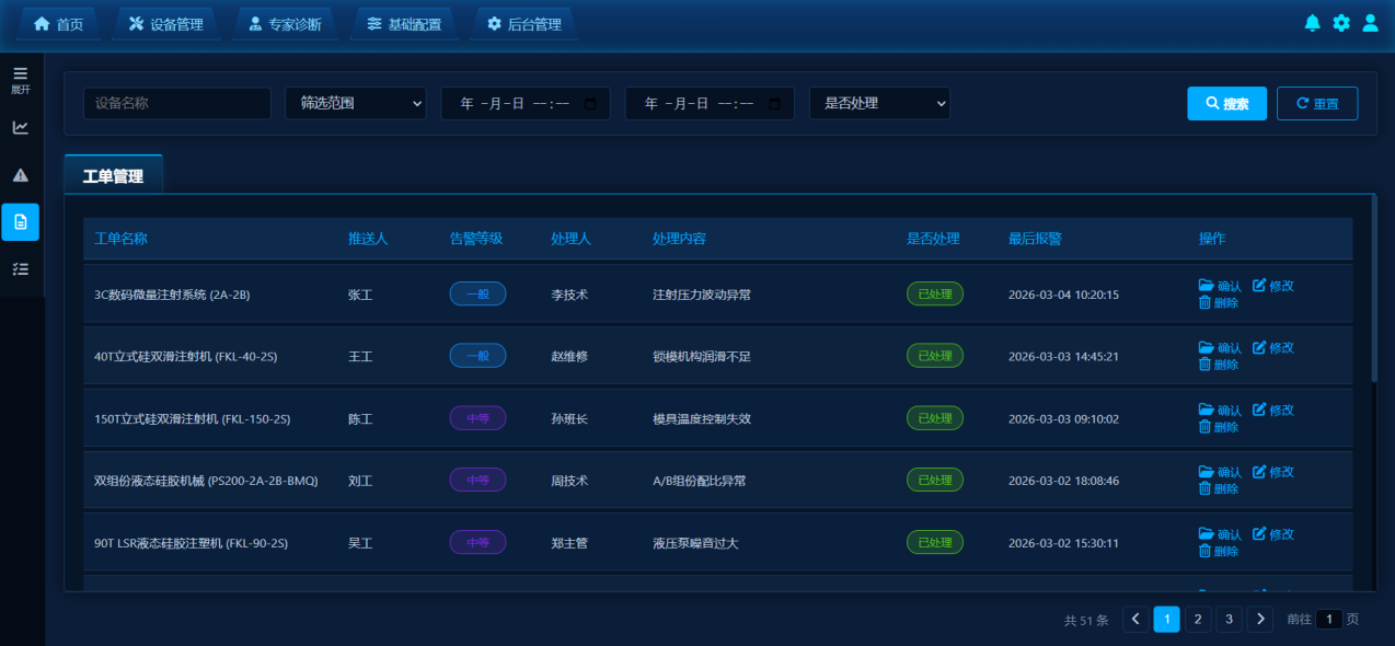 工单管理:设备异常自动触发工单,推送至对应工程师,实现从报警、派单、处理到验收的全流程闭环,提升售后响应效率。