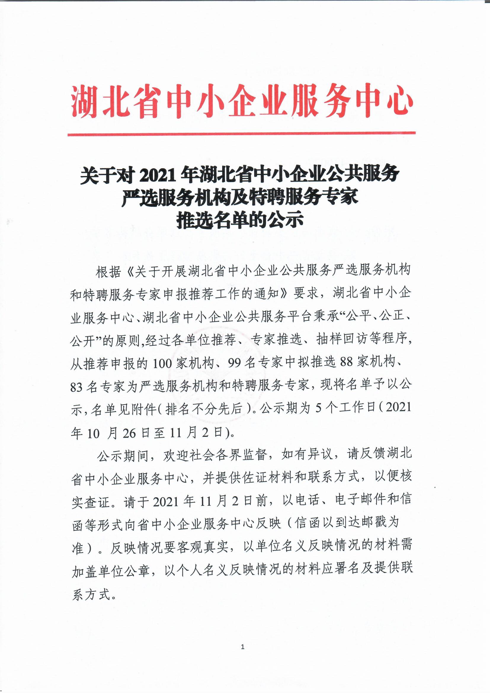 关于对2021年湖北省中小企业公共服务严选服务机构及特聘服务专家推选名单的公示