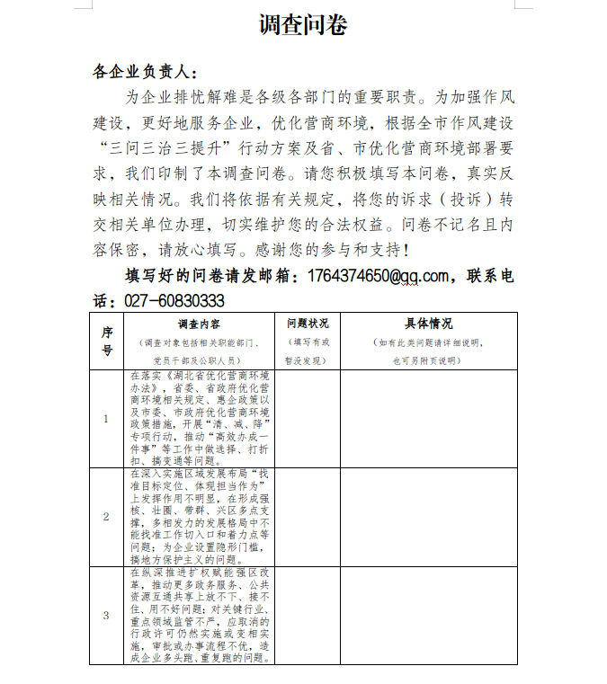 根据市作风建设“三问三治三提升”行动领导小组办公室工作安排,现将《调查问卷》发给你们,请你们仔细阅读并积极填报,共同促进我市营商环境持续优化。